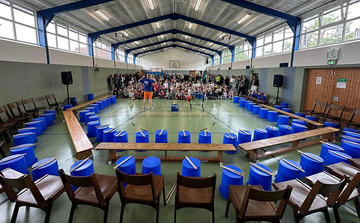 Trommeln macht Spaß, besonders wenn die gesamte Klasse gemeinsam aktiv wird! Mit blitzschnell erlernten Beats und Breaks begleiten die Kinder oder Jugendlichen bekannte Songs, die über ein professionelles Soundsystem abgespielt werden. Alle sitzen dabei im Halbkreis und trommeln mit Drumsticks auf blauen Buckets (Kunststoffeimern), während Motivator und Entertainer SUPER SASCHA wohlproportioniert neue Rhythmen und Moves verstreut.